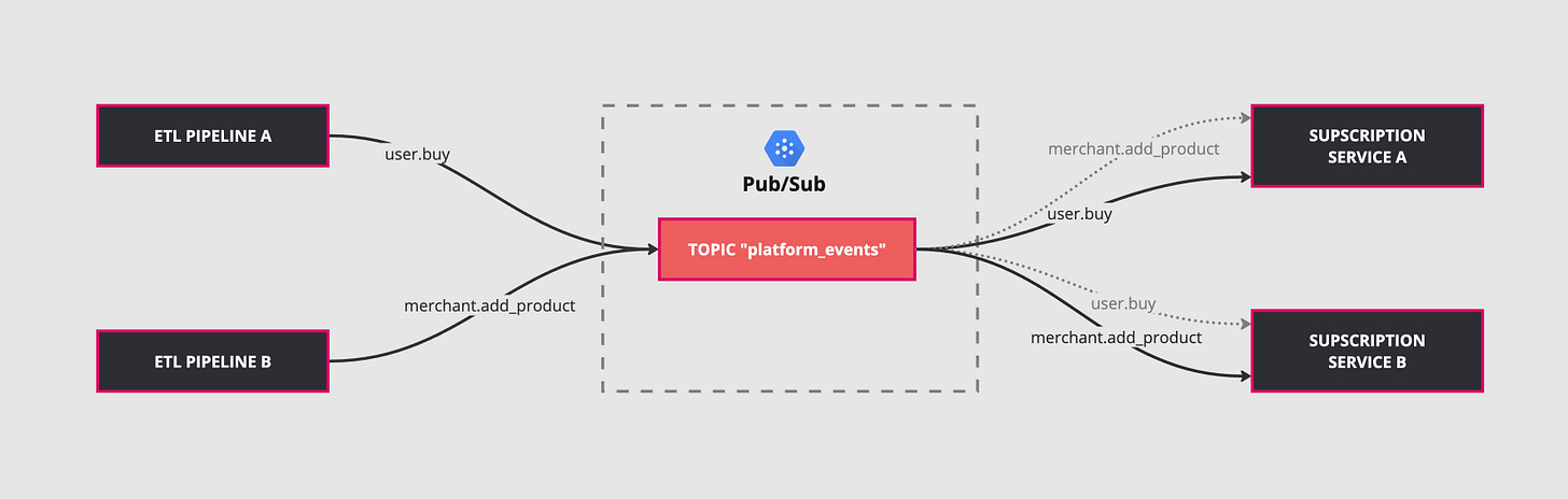 Each service, API, or daemon can decide to subscribe and consume or not consume different types of events. For instance, your API might be interested in knowing when an event of the type “user.buy” or “user.refund” happens but doesn’t care about “merchant.add_product” or “merchant.edit_product”.