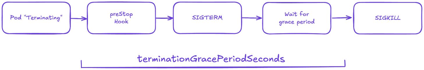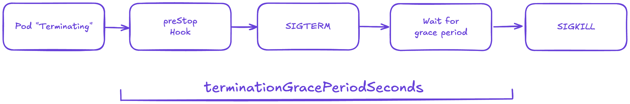 At this point, Kubernetes waits for a specified time called the termination grace period. By default, this is 30 seconds. It’s important to note that preStop hook must complete its execution before the TERM signal can be sent.