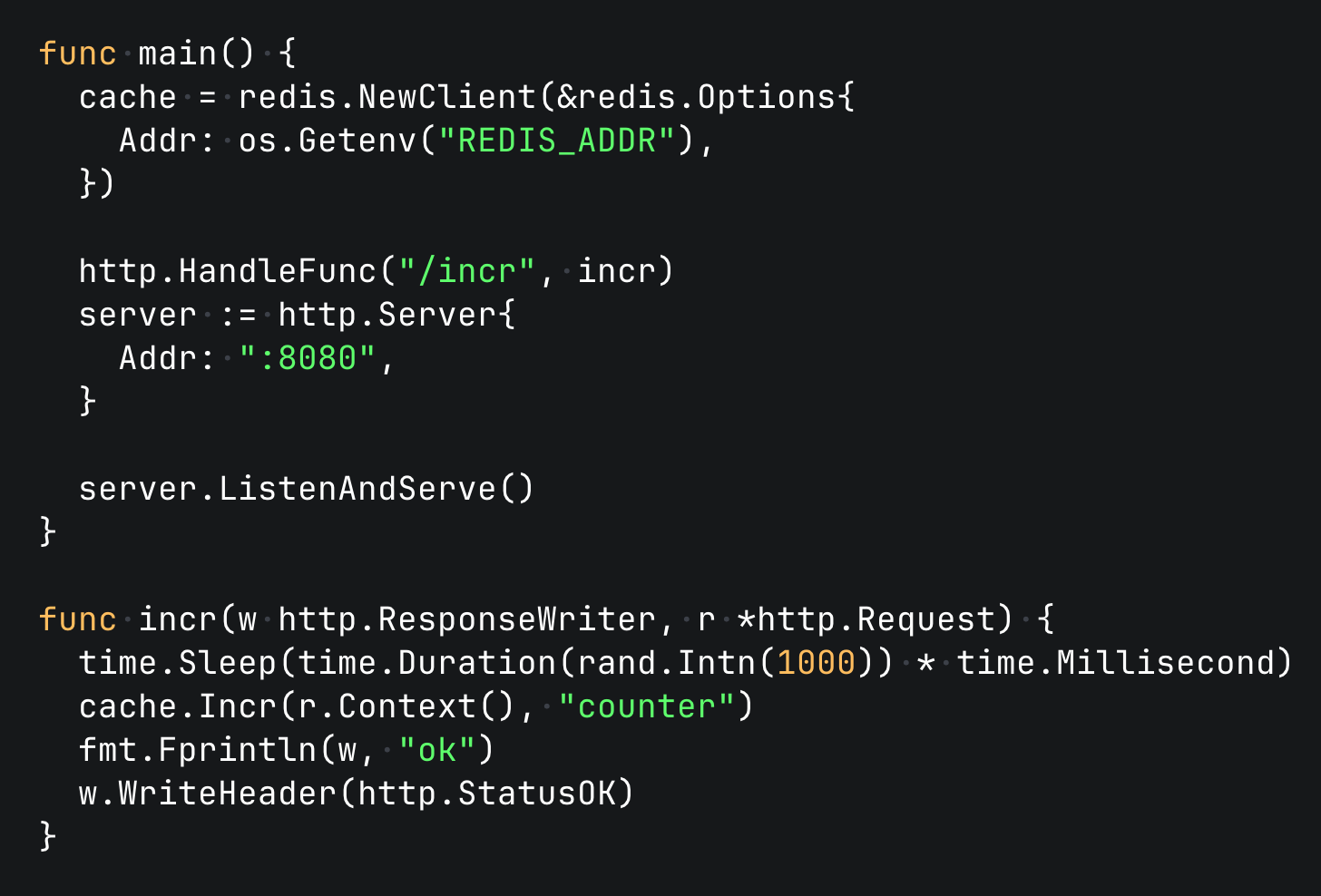 To explore the world of graceful shutdowns in a practical setting, let's create a simple service we can experiment with. This "guinea pig" service will have a single endpoint that simulates some real-world work (we’ll add a slight delay) by calling Redis's INCR command. We'll also provide a basic Kubernetes configuration to test how the platform handles termination signals.
