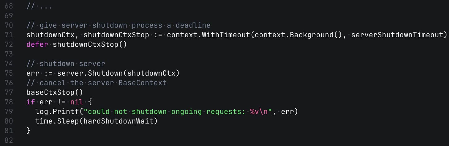 It's worth mentioning that if you want to make a shutdown process really smooth, all your functions should respect context cancellation and ideally not use context.Background() / context.TODO(). Because functions that use context.Background() don't respect cancellations.