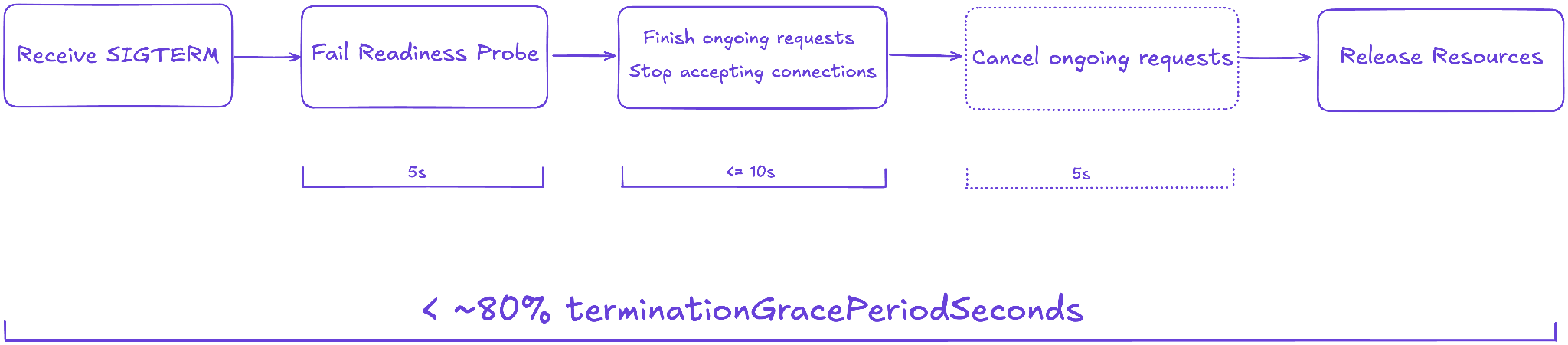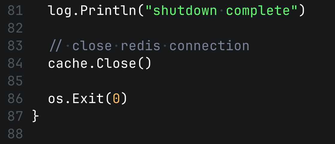 And as the last action we release critical resources, connections to databases, caches, etc. Close file descriptors, etc. You should delay the resource cleanup until the shutdown timeout has passed or all requests are done. Also it's good to specify the exit code explicitly.