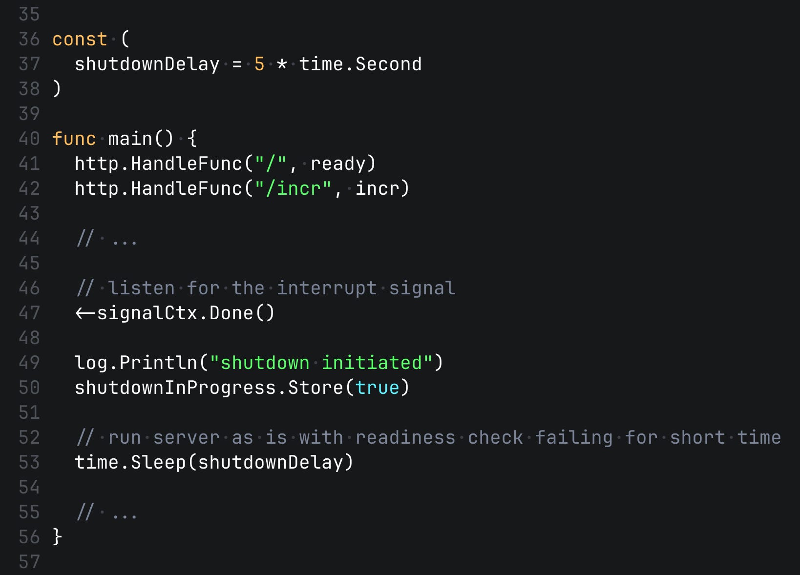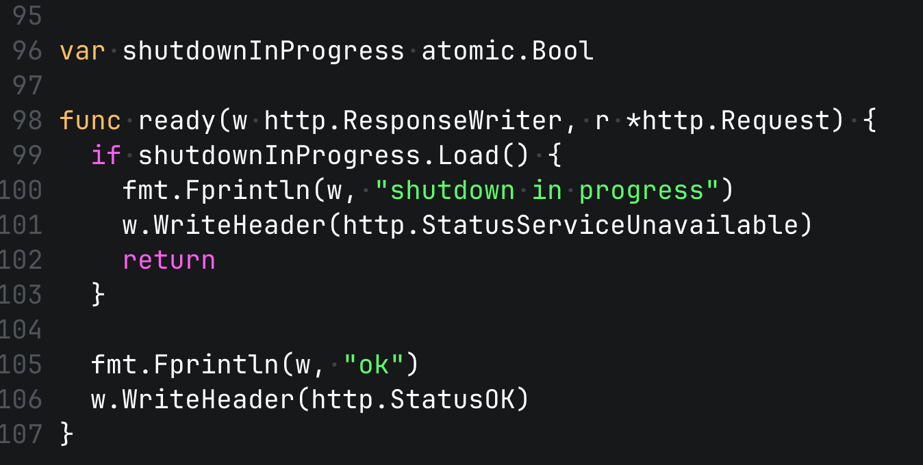 We can nicely use atomics here to switch the readiness status when we receive the SIGTERM.