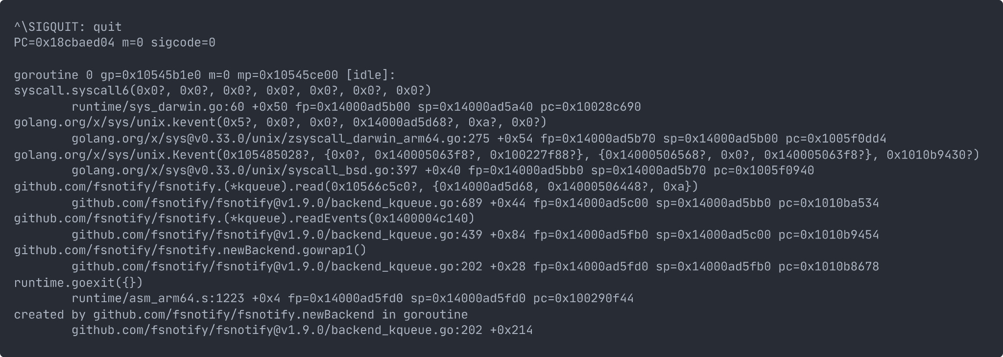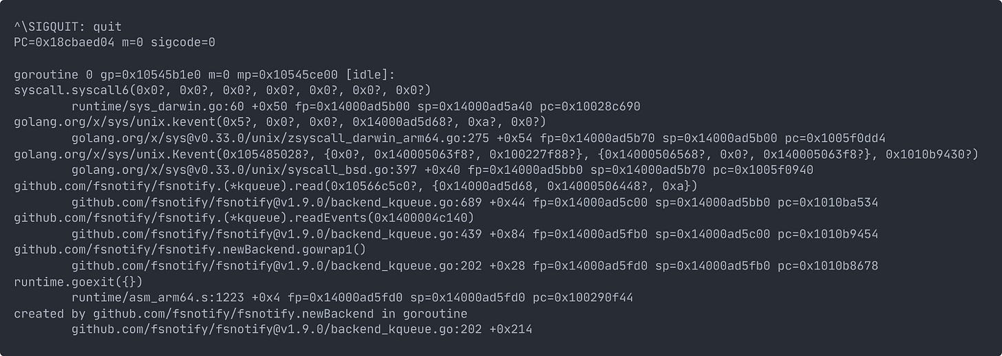 Also, when the Go runtime receives SIGQUIT (Ctrl + \), it prints a stack trace to the terminal before exiting the process. This can be helpful for debugging a hanging unresponsive program.