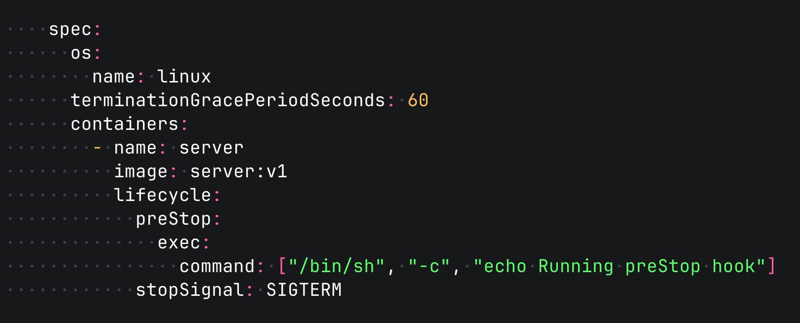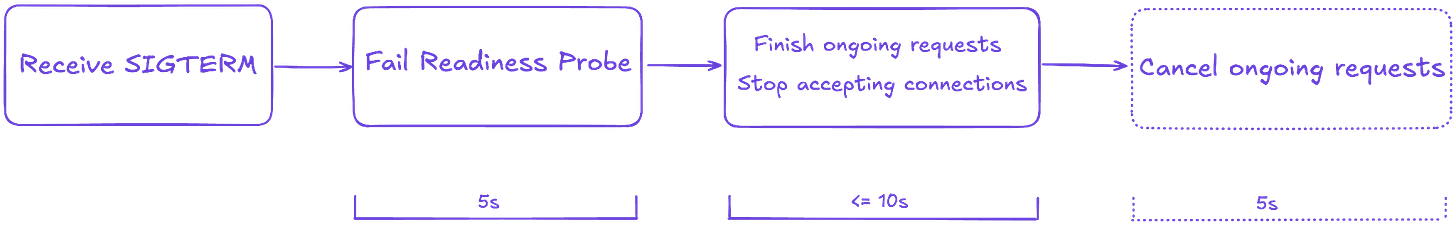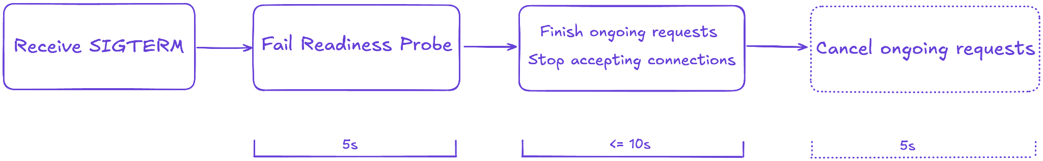 For those who are interested in testing this out, I prepared a full project with Kubernetes manifest and some load testing. There we can clearly see that the server without a graceful shutdown loses some portion of requests during the rolling update. While the server with - doesn't.