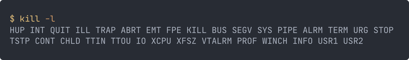SIGTERM - sent to a process to request its termination. Most commonly used, and we’ll be focusing on it later.