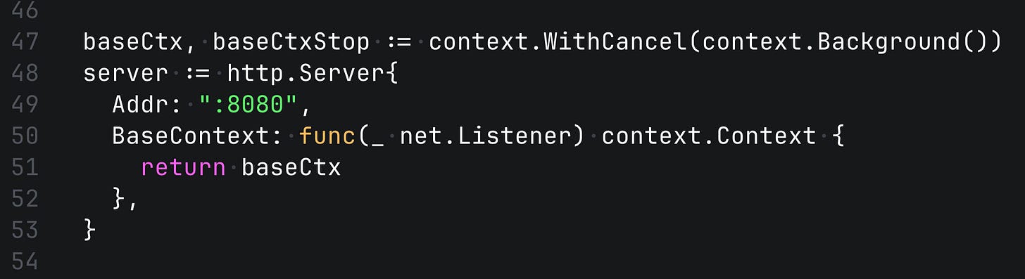 http.Server accepts the BaseContext. This context is shared across all incoming requests, and it can be handy during the shutdown process, for example to send the cancellation if there are still any running requests.